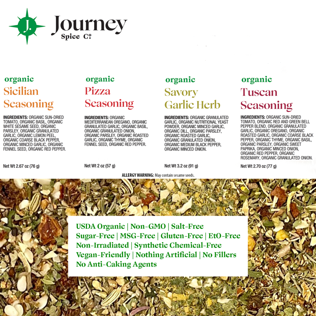Journey Spice Co.’s Organic Sicilian Seasoning is inspired by the stunningly beautiful Mediterranean island of Sicily and all of the flavors within. It is absolutely delectable as bread dipping seasoning with extra virgin olive oil, and on seafood, chicken and other poultry, tofu, pasta, pizza, salad dressings, and more.
