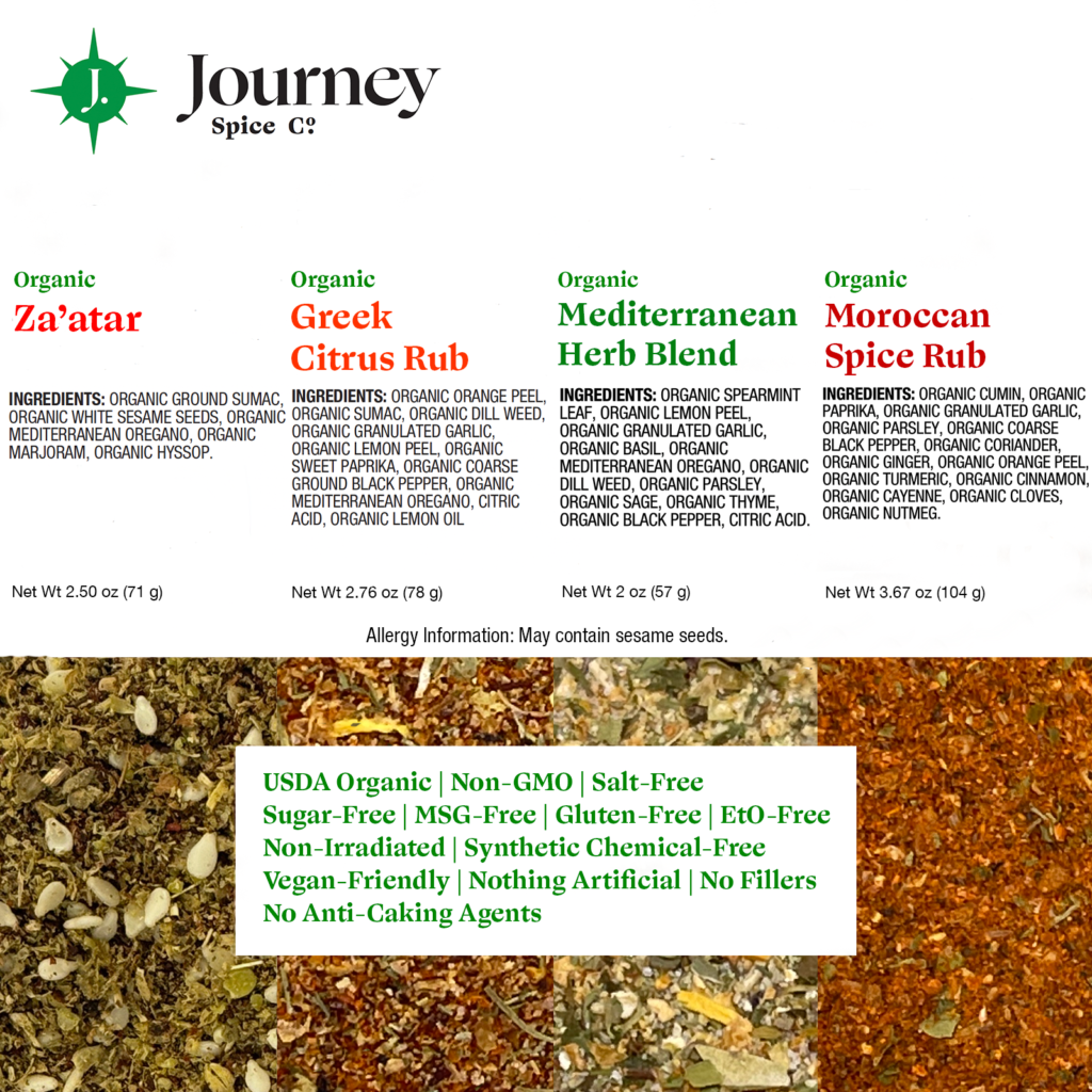 Journey Spice Co.’s Organic Moroccan Spice Rub is inspired by Mediterranean flavors iconic to Morocco and other parts of Northern Africa. This bold and flavorful spice blend tastes amazing on chicken, pork, gyro meat, shawarma, fish, tofu, seitan, and many other recipes.